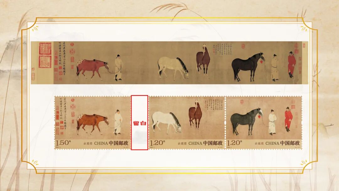 但《出圉图》中的马,展现的是马文雅的一面,带着宋画的淡雅气质。所以在设计中,我特意抽离了唐三彩马等固有的矫健印象,重点突出马的文雅神韵,让邮票呈现出与传统马形象不一样的美感,也贴合原画的整体气质。