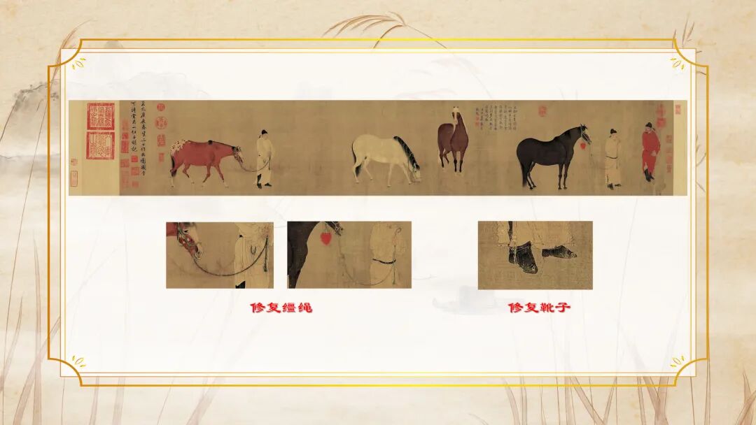 还有原画的修复工作,故宫博物院提供的高清扫描图,有很多绢布破损和裂纹,有的裂纹甚至像草地纹理,我一开始还误以为是作者的创作,后来才发现是绢布破损,之后就对破损部分进行了修复,对于无法修复的破损,则保留原状,力求在还原古貌的同时,让画面更舒适。这些细节,都是AI无法理解、无法替代的,必须有人的温度在里面。