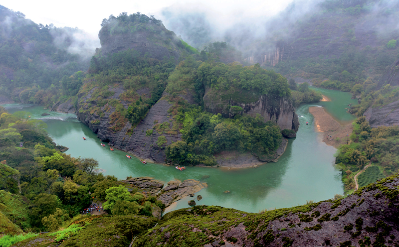 晨雾漫过武夷群峰,九曲溪如碧绿丝带缠绕山间。九曲溪上,竹筏破水而行,清脆的讲解声随溪流荡漾;山腰茶园间,锄头挥舞,指尖拂过带着晨露的茶芽;深山密林中,身影穿梭,脚步踏过蜿蜒山径,目光追随着林间生灵的踪迹。在武夷山国家公园大约1280平方千米的土地上,不同身份的守护者,用各自的坚守与担当,共同书写着人与自然和谐共生的动人篇章。