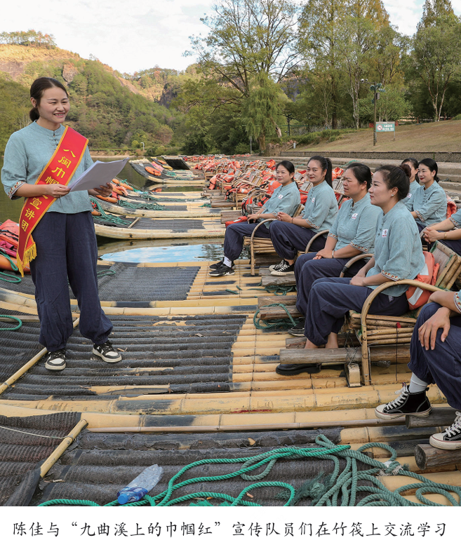 从九曲溪的历史人文到生态保护,从当地的民俗风情到“三茶”统筹发展,陈佳把“文化传承与生态保护”科普课堂开设到九曲溪上,她的竹筏不仅是游览工具,更是面向游客进行生态文明、绿色生态宣讲的“阵地”。看到溪水中的垃圾,她会主动打捞;讲解词中会自然融入生态保护理念,把“九曲溪常年保持Ⅰ类水质”的生态数据,变成游客听得懂的家常话。为了更好地把“保护绿水青山”的理念传递给游客,工作20余年,陈佳一直在持续研究、更新讲解词,追求将武夷山的人文山水、发展理念更全面地融入讲解。2022年,她牵头成立“九曲溪上的巾帼红”宣讲队,带领24名女筏工走进学校、社区,两年间开展宣讲1.9万次,让15万余人次感受到武夷山水的生态之美。