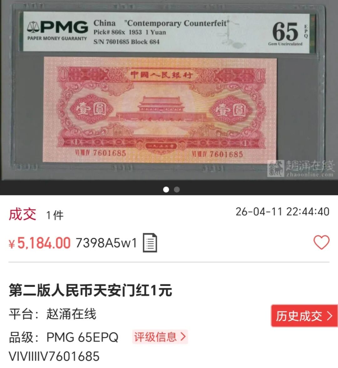 近期,赵涌在线一张我们非常熟悉的、印着天安门图案的1元纸币,也就是第二版人民币天安门红1元,拍出了5000多元!