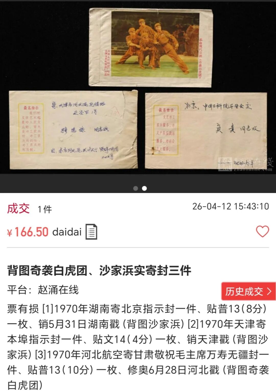 2026年4月12日,赵涌在线拍卖平台上,一组“奇袭白虎团、沙家浜实寄封三件”以166.50元成交。三枚1970年的实寄封,售价标注为“票有损”,品相不算完美,却仍然找到了买家。这166块5毛钱买到的,不仅是三张泛黄的老纸片,更是一把打开半个多世纪前历史大门的钥匙。