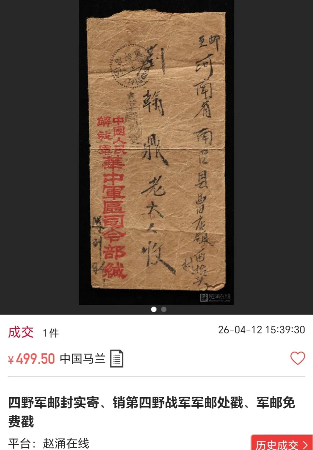 前几天,赵涌在线上成交了一枚第四野战军实寄军邮封,成交价499.50元,具体见下图。