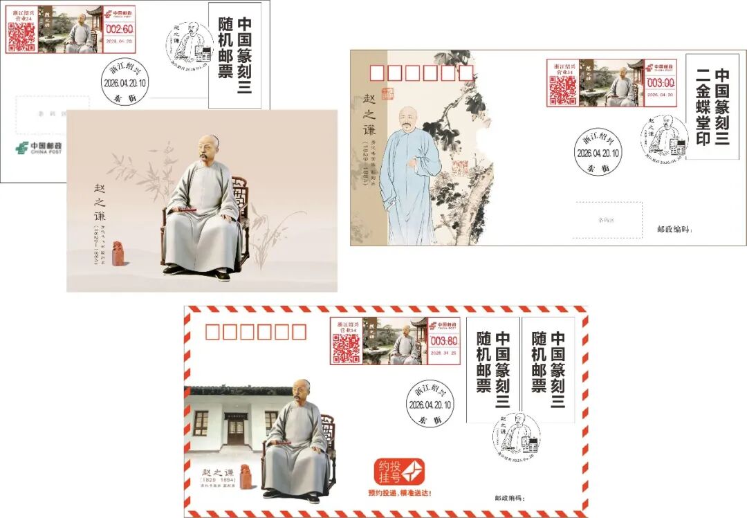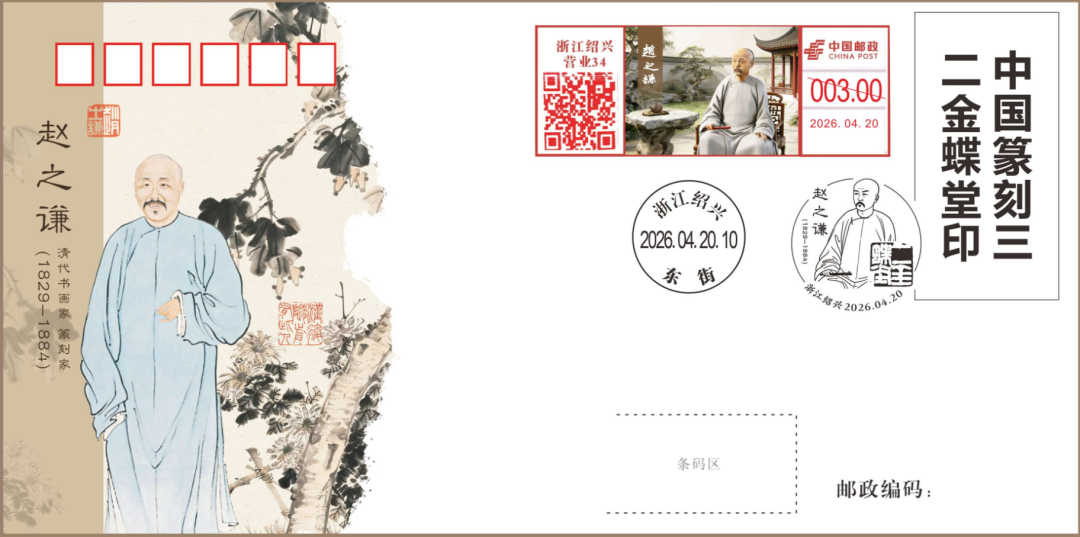 中国邮政将于2026年4月20日发行《中国篆刻》(三)邮票一套4枚,其中一枚邮票图案为赵之谦所制二金蝶堂印。赵之谦是浙江会稽(今绍兴)人,清代著名书画家、篆刻家。经中国邮政集团有限公司批准,浙江省绍兴市邮政分公司将于2026年4月20日启用“赵之谦”彩色数字打印型邮资机戳一枚。为方便大家收藏,《集邮》杂志微店上架了相关实寄邮品。挂号实寄封使用美术封为载体,加贴“二金蝶堂”邮票1枚,使用“赵之谦”彩色数字打印型邮资机戳补资,盖销“赵之谦”文化日戳及浙江绍兴东街邮政日戳,挂号实寄给预订者。识别上方二维码即可预订。约投挂号实寄封使用美术约投封为载体,加贴《中国篆刻》(三)邮票1套4枚,使用“赵之谦”彩色数字打印型邮资机戳补资,盖销“赵之谦”文化日戳及浙江绍兴东街邮政日戳,约投挂号实寄给预订者。识别上方二维码即可预订。包含1片2封,实寄明信片使用美术明信片为载体,随机加贴《中国篆刻》(三)邮票1枚;挂号实寄封使用美术封为载体,加贴“二金蝶堂”邮票1枚;约投挂号实寄封使用美术约投封为载体,随机加贴《中国篆刻》(三)邮票2枚,均使用“赵之谦”彩色数字打印型邮资机戳补资,盖销“赵之谦”文化日戳及浙江绍兴东街邮政日戳,实寄给预订者。识别上方二维码即可预订。