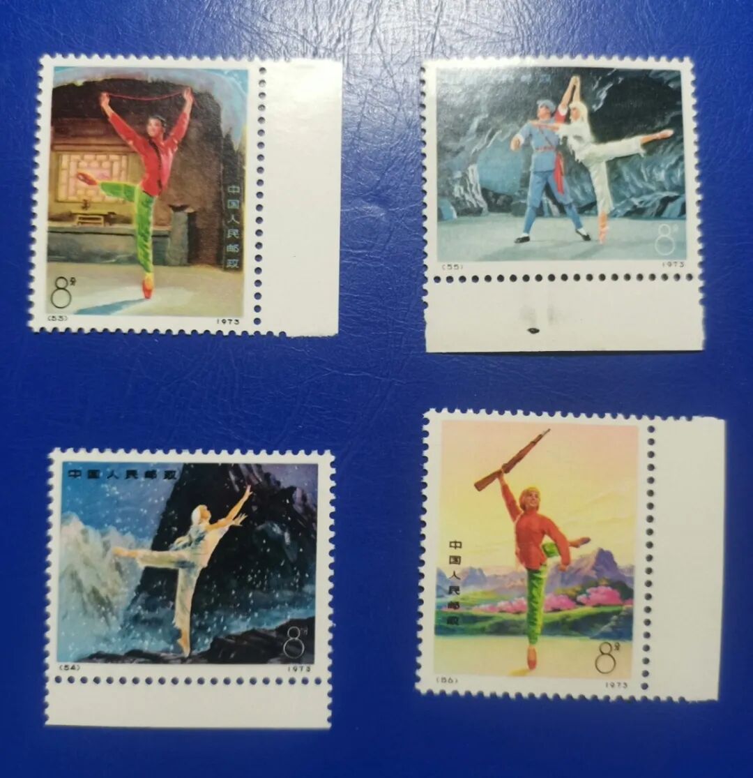 这四枚邮票有三个谁都比不了的“特殊身份”——它是新中国邮票中首次试用“高光泽邮票纸”印制的邮票,画面色泽丰富滋润,网纹完整清晰;它是1973年邮电部恢复运作后发行的第一套编号邮票;它还是一套用舞台艺术定格时代精神的艺术结晶。