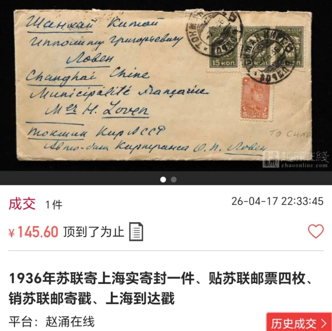 一枚1936年从苏联寄往上海的旧信封,贴着一版四枚苏联邮票,盖着中外两国的邮戳,2026年4月18日刚在赵涌在线以145.60元成交。