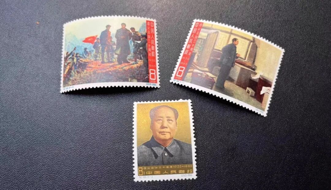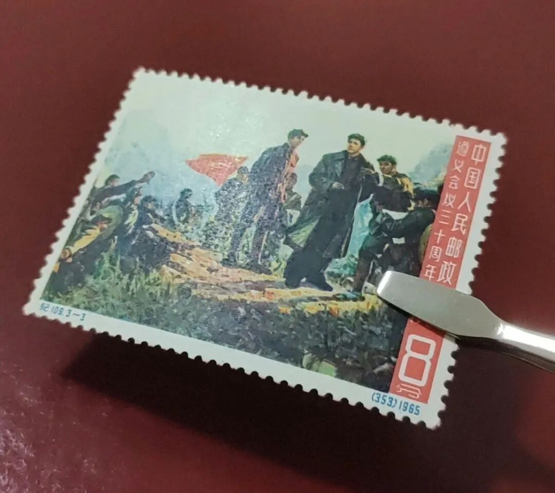 1965年1月31日,邮电部发行了一套名为《遵义会议三十周年》的纪念邮票,编号纪109,全套共3枚,面值各8分,发行量均为1000万套,由新中国邮票设计大家刘硕仁操刀。三枚邮票分别是“决战前夕”、“毛主席像”和“娄山关大捷”,分别记录了长征途中最关键的三个历史瞬间。