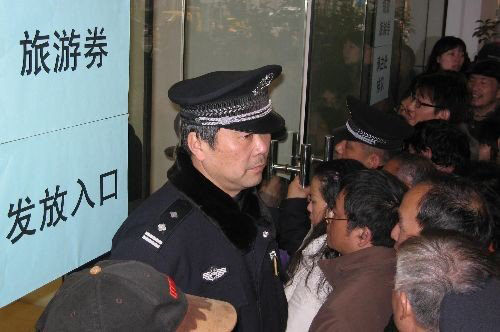 在现场采访的葛先生,上午7时多等候在银行门口,本以为早早前来等候,下午1时申领时绝对能够得到,不料申领开始后半小时,银行工作人员用喇叭通知旅游券即将领完,本排起长龙的队伍瞬间失去队形,向不大的银行门口用来,葛先生瘦弱,被挤出人群。在现场,围栏被挤倒,有些老人明显情绪失控,秦阿姨就是其中之一,她向记者忿忿不平:“老人出门不易,借着旅游券旅游省钱不少,现在看来发放实在是没有组织好。”就此,采访了银行内工作人员,当班经理向新民网记者表示,先前已做足准备,但该职员表示:“民众热情太高,我们始料不及!”