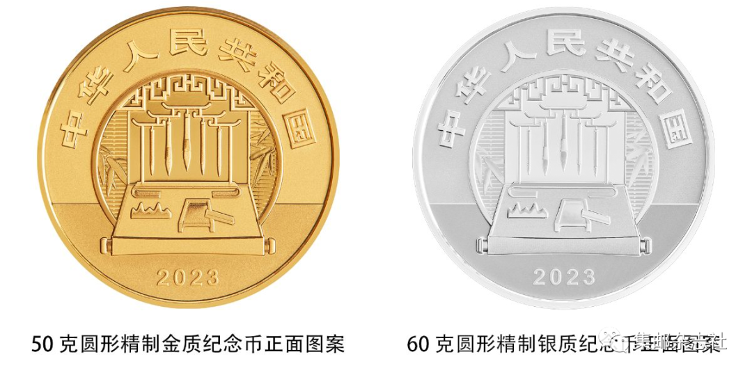 4枚圆形金银纪念币正面图案均为笔、墨、纸、砚造型,辅以竹叶、窗等装饰组合设计,并刊国名、年号。500克长方形银质纪念币正面图案为山、水等组合设计,并刊国名、年号。
