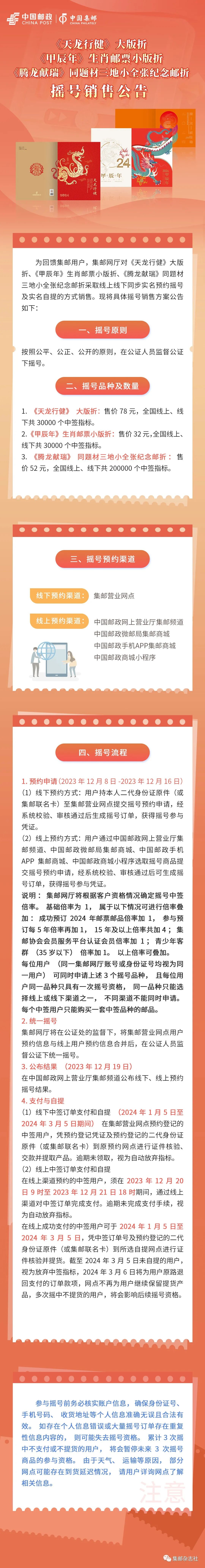 日前,中国邮政在其官网上发布《甲辰年》邮票版式一、版式二以及同题材小全张等邮票邮折摇号销售的公告,本次摇号将于2023年12月16日结束,还没有参加摇号的朋友要抓紧时间了。本次摇号公告详情如下。