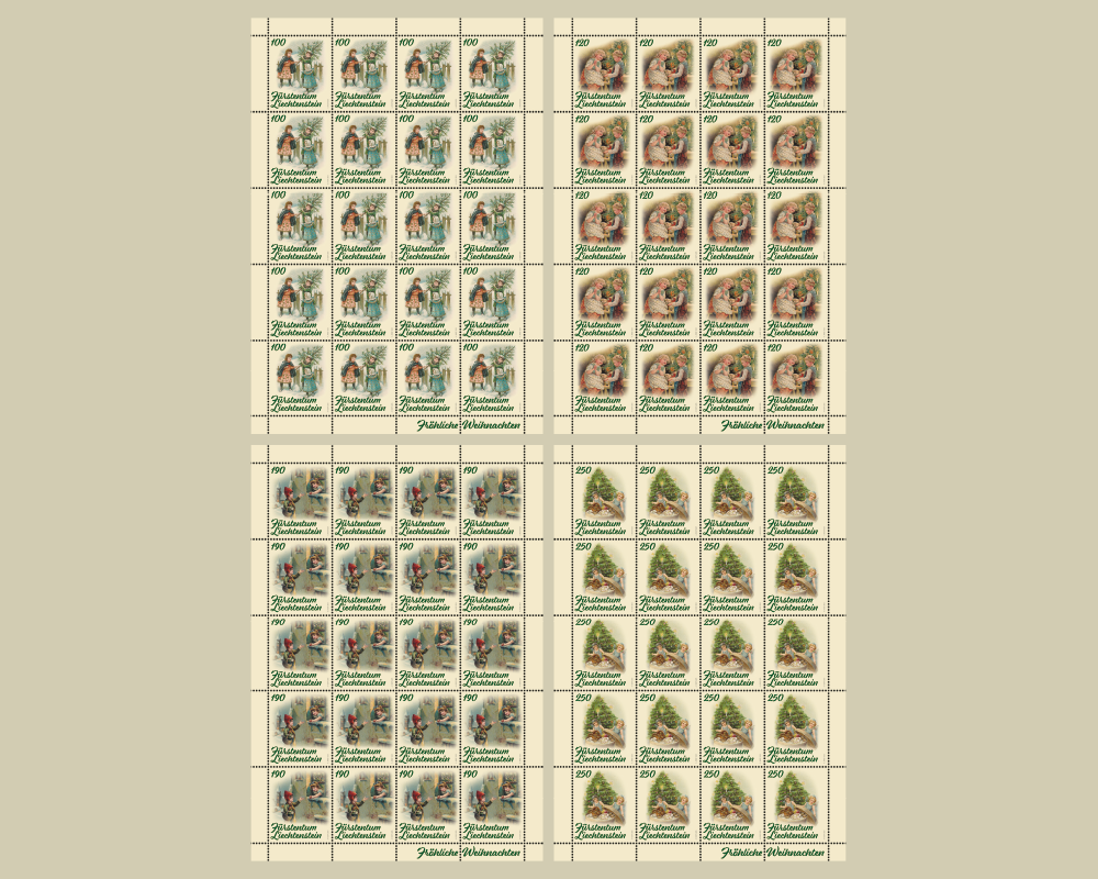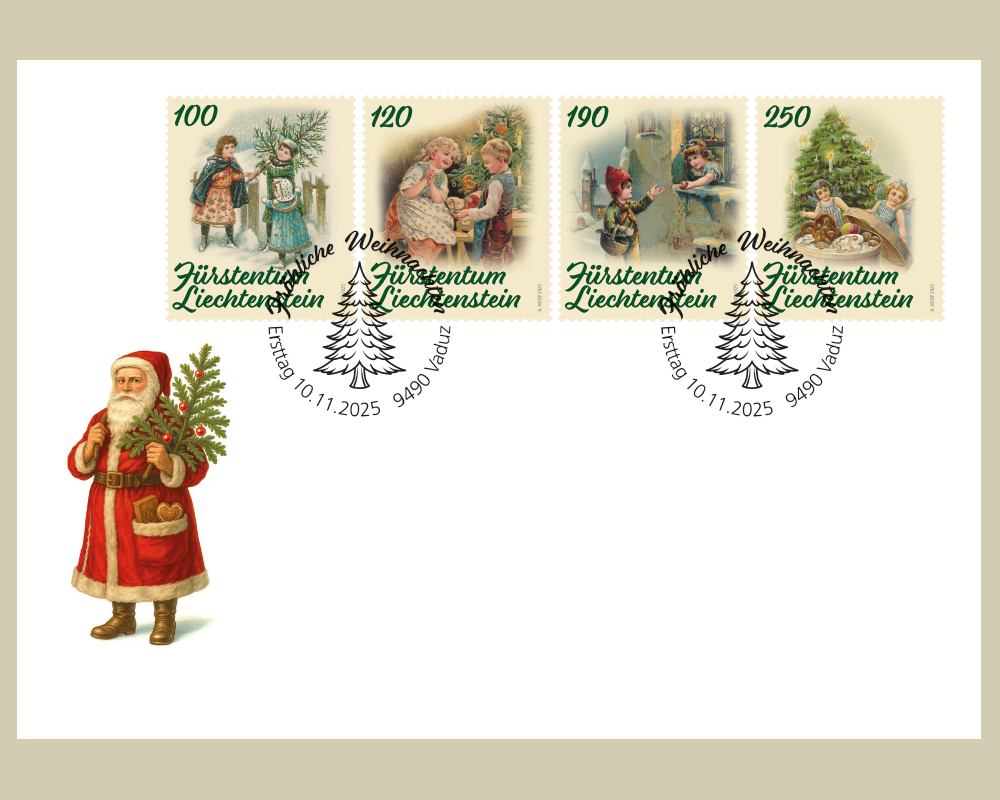This year's Christmas issue features lovingly designed motifs of historical greeting cards from the original holdings of the Liechtenstein National Archives. The four stamps - “Christmas tree” (face value CHF 1.00), “Gift-giving” (face value CHF 1.20), “Friendship” (face value CHF 1.90) and “Tasty treat” (face value CHF 2.50) - appear in a practical, self-adhesive sheet of 20.