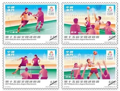 2025年11月9日,澳门邮政将发行《第十五届全国运动会》邮票一套4枚,名称及面值分别为: 三人篮球 2.50元、五人篮球 4.00元、乒乓球 4.50元、排球 6.00元。