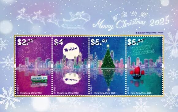 11月25日,香港邮政将发行《圣诞邮票V》特别邮票一套4枚,面值分别为2.20元、4元、5.40元、5.50元,同时推出小全张1枚。邮票设计为李嘉朗。邮票以维港夜景为背景,在星空下呈现各式各样的圣诞元素和节日的欢乐。