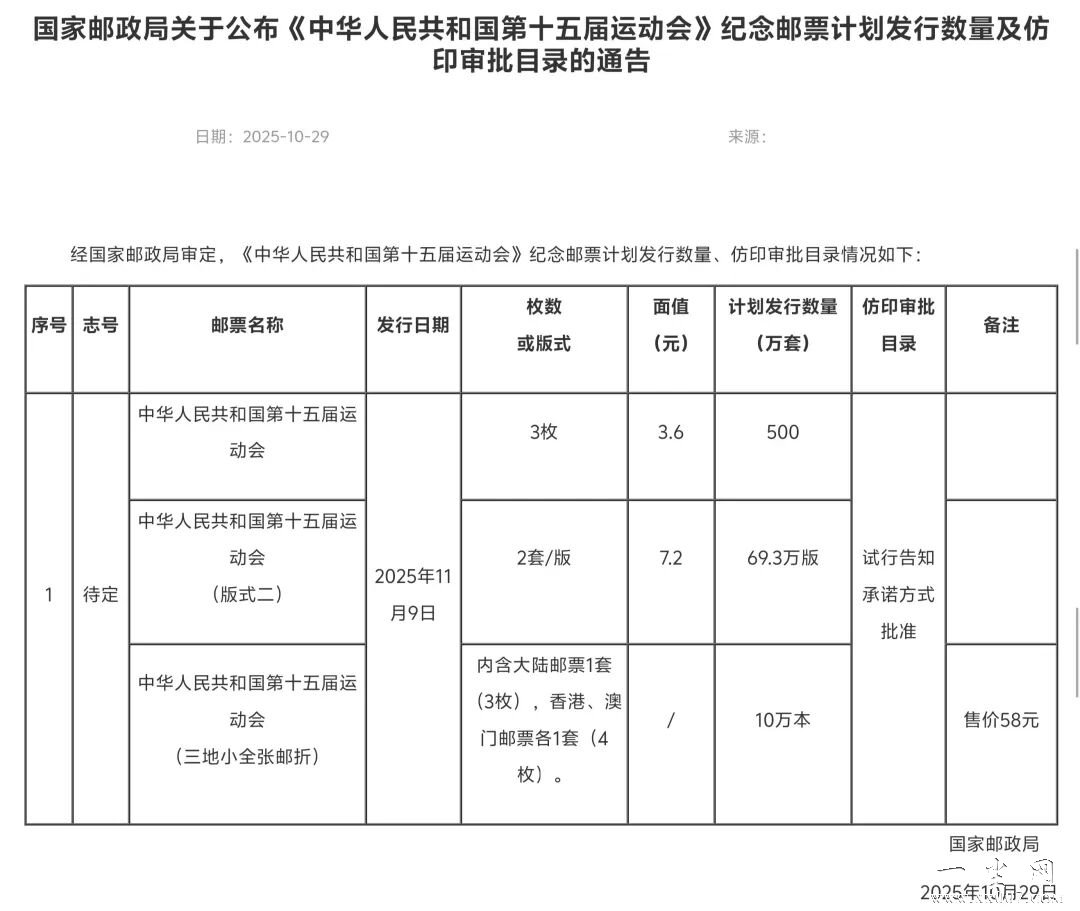 11月新邮发行量公布