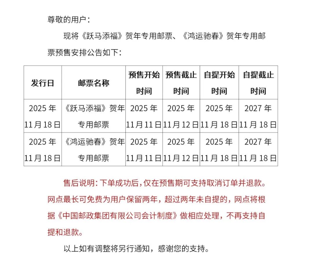 《跃马添福》贺年专用邮票、《鸿运驰春》贺年专用邮票预售安排