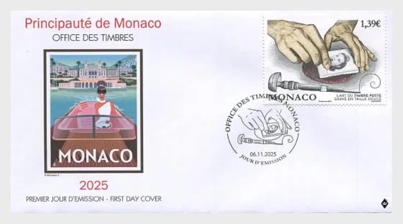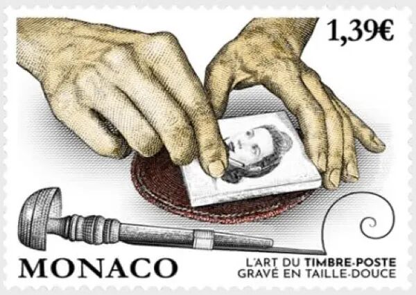 11月6日,摩纳哥邮政发行1枚《邮票凹版雕刻艺术》邮票,图案为一双正在雕刻邮票凹版母模的手及一把雕刻刀,面值1.39欧元。