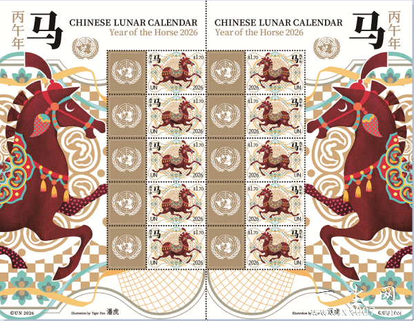 联合国邮政近日揭晓了将于2026年1月16日发行的马年生肖邮票图案,该票仅在联合国邮政纽约邮局以小版张形式发行。