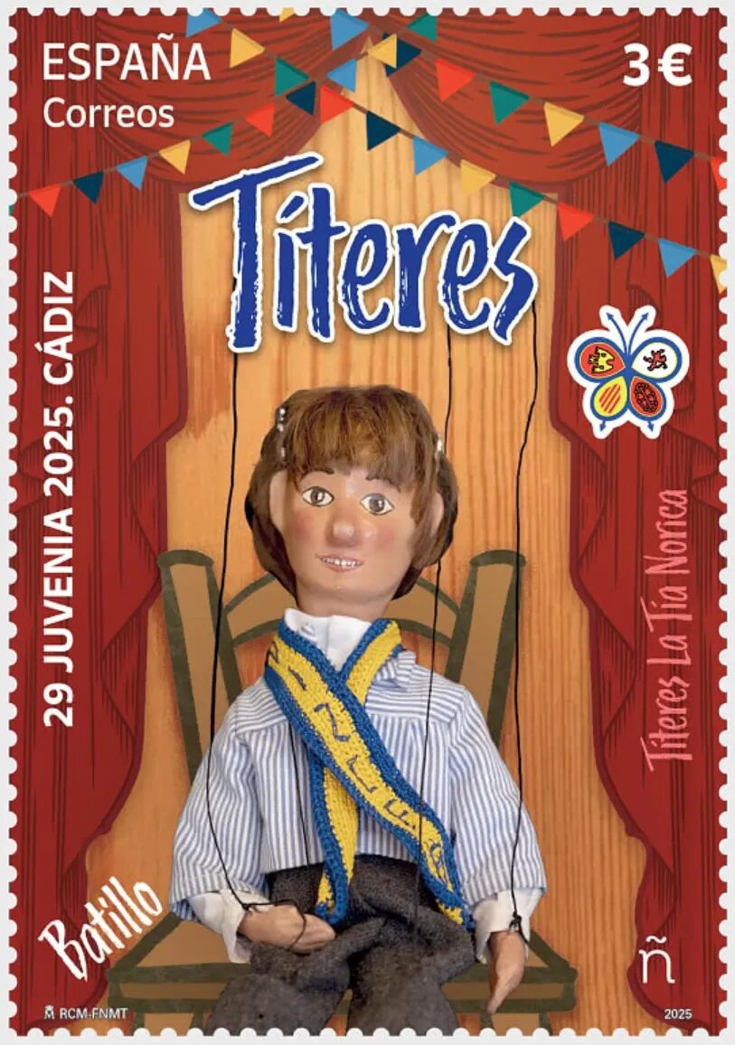 《第29届加的斯青少年邮展》邮票1套1枚。由于面向年轻观众,本届邮展确定的主题是“木偶戏”。邮票主图展示了拉蒂亚诺里卡木偶剧团的木偶戏人物“巴蒂略”,他是木偶戏《诺里卡婶婶冒险故事》中的核心人物,象征着加的斯人民的情感和个性。
