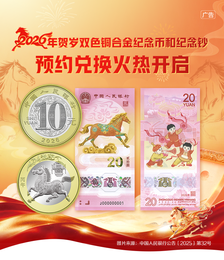 根据中国人民银行公告〔2025〕第32号,2026年贺岁双色铜合金纪念币(以下简称“2026年贺岁币”)和2026年贺岁纪念钞(以下简称“2026年贺岁钞”)将于2026年1月13日开启预约。2026年贺岁币每枚面额10元,每人最多可预约、兑换20枚。2026年贺岁纪念钞每张面额20元,每人最多可预约、兑换20张。中国邮政储蓄银行(以下简称“我行”)在部分地区承担预约兑换工作。