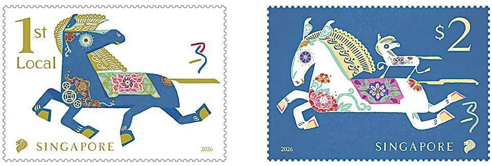 新加坡于1月23日发行马年生肖邮票1套2枚,同时发行限量版异形小型张1枚以及小版张、小本票等。邮票图案分别为白底蓝马和蓝底白马,充满活力动感的装饰风格和色彩反转效果秉承了该轮生肖邮票的特色。邮票采用平版胶印技术,结合激光模切与烫金工艺。