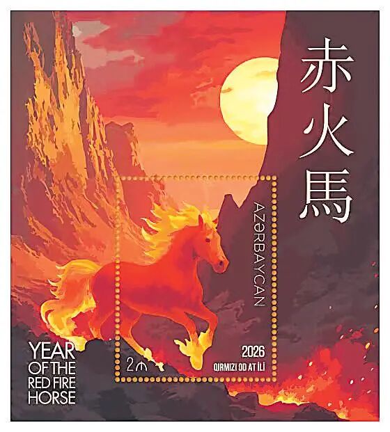 阿塞拜疆于1月29日发行马年生肖小型张1枚,小型张邮票图案表现了奔腾的骏马、祥云、火纹,边饰上印有“赤火马”中文字样,纪念戳特意设计成马蹄形。