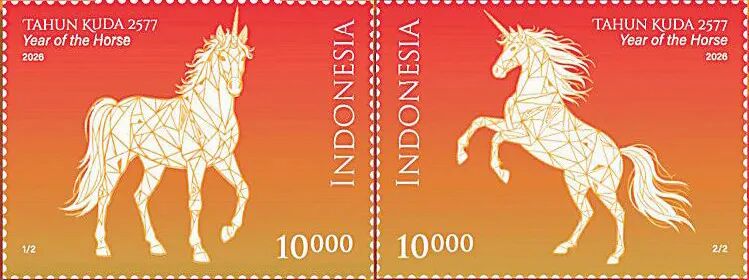 印度尼西亚于2月10日发行马年生肖邮票1套2枚和小型张1枚。两枚邮票图案表现了由马演化而来的神话形象独角兽。小型张含4枚邮票,其中2枚图案为独角兽,另2枚图案为国际象棋中的“马”棋子。