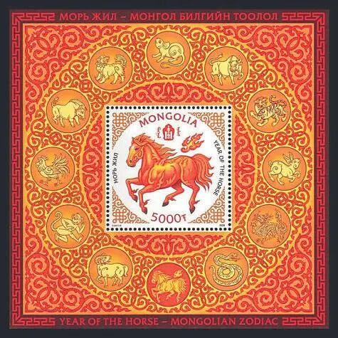蒙古国于2月11日发行《马年生肖》邮票1套2枚及小型张1枚。邮票图案表现了两匹相对奋蹄的“红火马”,邮票设计采用蒙古国传统绘画风格,背景点缀火焰纹饰,体现了马热情奔放的个性。小型张邮票图案同样为“红火马”,边饰为十二生肖年轮,其中位于下方中间的生肖马特意以红底色进行强调。邮票发行后,蒙古国邮政和一些集邮爱好者很快发现小型张边饰十二生肖年轮中的生肖狗和生肖猪顺序有误。目前,该小型张已停止销售,蒙古国邮政紧急新发行了1枚邮票作为替代,图案与小型张邮票相同。