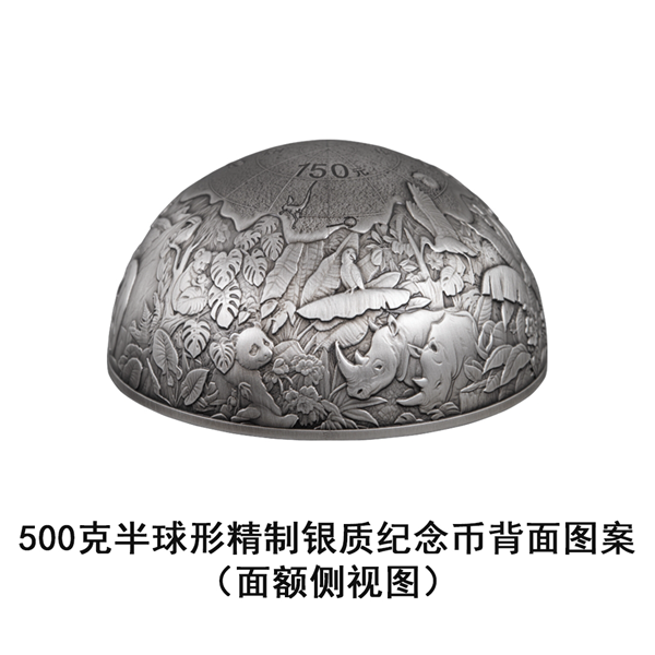 500克半球形银质纪念币背面图案为地球动植物代表性物种,以及化石、经纬线等组合设计,并刊“守护地球家园”字样及面额。