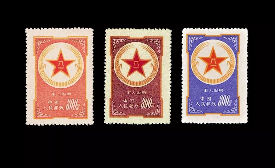 1953年8月1日由邮电部负责设计发行一套军人贴用邮票,这套邮票共3枚,面值800元(旧币),底色分别用橘黄、紫色、蓝色来表示陆、空、海三军,被集邮界简称为“黄军邮”、“紫军邮”、“蓝军邮”。