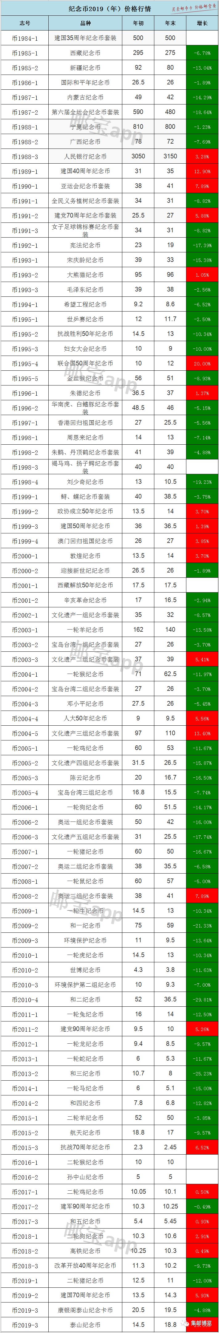 奥运一组纪念币套装2019年初行情价格为50元,年末价格为42元,下跌16.00%。