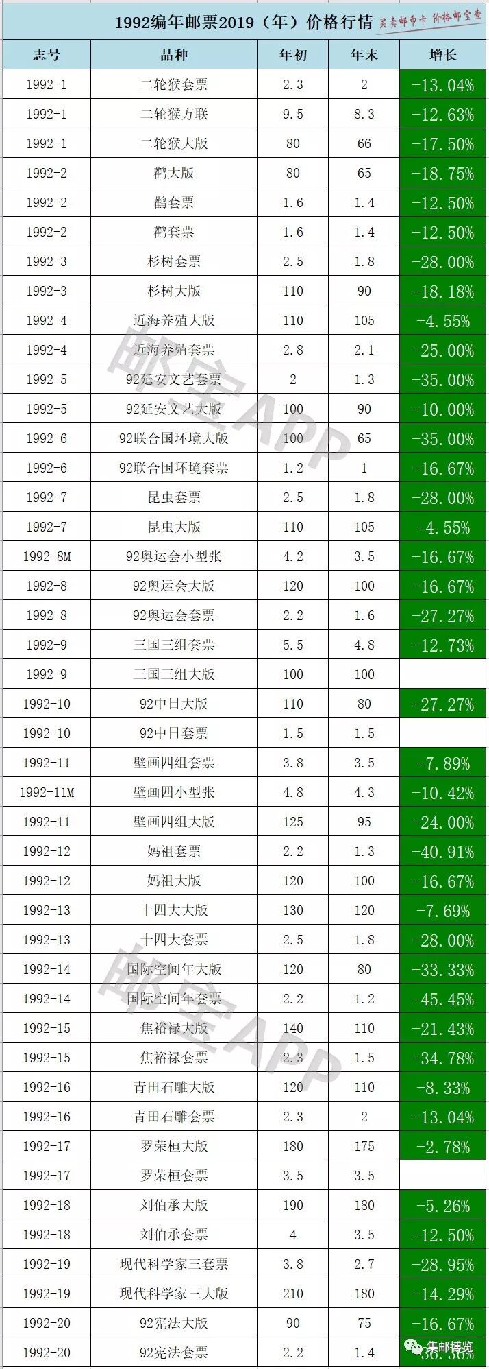 小编为大家整理了自1992年起编年邮票在2019年度的行情对比,今天对比的是1992、1993、1994三年,后续将分几期陆续推送,敬请关注~