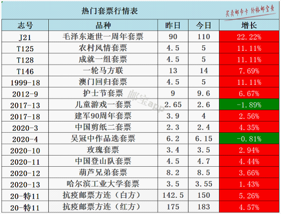 毛泽东逝世一周年套票今日最新价格为110元,昨日价格为90元,上涨22.22%。