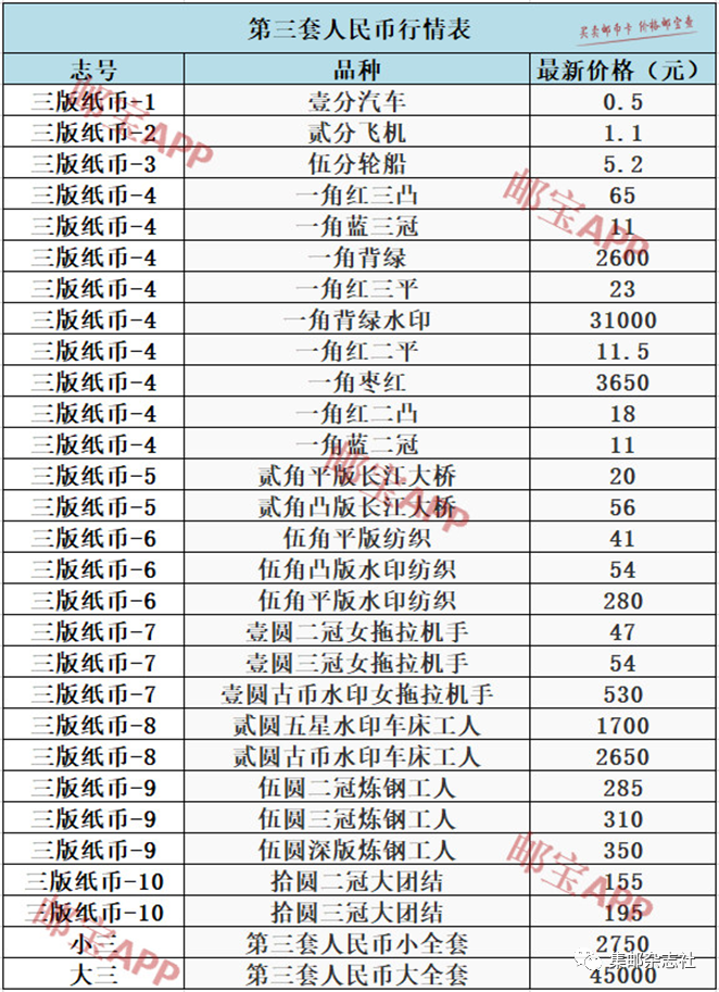近期,第三版人民币成为市场上热门品种,今天我们通过“邮宝”APP为大家采集了市场上第三版人民币的交易价格供大家参考。