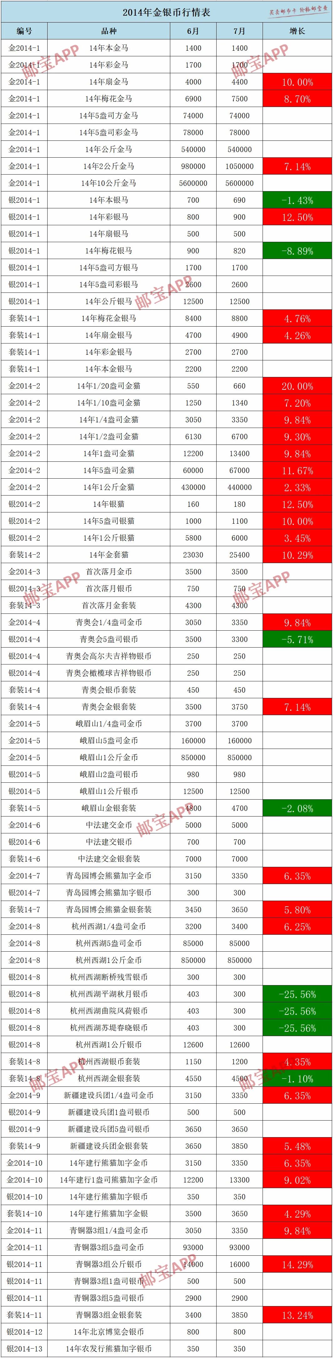 其他2014年金银币也有涨跌,变化不大,具体明细请查看下表或前往邮宝APP查询。