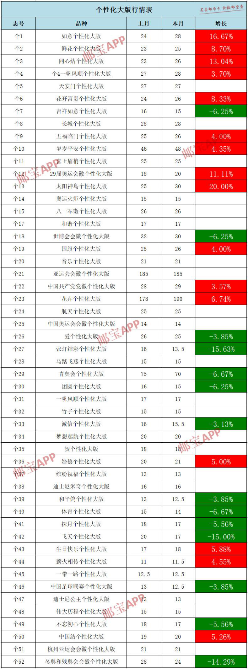 太阳神鸟个性化大版本月最新行情为30元,上月价格为25元,上涨20.00%。如意个性化大版本月最新行情为28元,上月价格为24元,上涨16.67%。同心结个性化大版本月最新行情为26元,上月价格为23元,上涨13.04%。29届奥运会徽个性化大版本月最新行情为20元,上月价格为18元,上涨11.11%。鲜花个性化大版本月最新行情为25元,上月价格为23元,上涨8.70%。花开富贵个性化大版本月最新行情为26元,上月价格为24元,上涨8.33%。花卉个性化大版本月最新行情为190元,上月价格为178元,上涨6.74%。生日快乐个性化大版本月最新行情为18元,上月价格为17元,上涨5.88%。中国结个性化大版本月最新行情为20元,上月价格为19元,上涨5.26%。婚禧个性化大版本月最新行情为21元,上月价格为20元,上涨5.00%。薪火相传个性化大版本月最新行情为11.5元,上月价格为11元,上涨4.55%。岁岁平安个性化大版本月最新行情为48元,上月价格为46元,上涨4.35%。五福临门个性化大版本月最新行情为26元,上月价格为25元,上涨4.00%。国旗个性化大版本月最新行情为26元,上月价格为25元,上涨4.00%。张灯结彩个性化大版本月最新行情为13.5元,上月价格为16元,下跌15.63%。飞天个性化大版本月最新行情为17元,上月价格为20元,下跌15.00%。冬奥和残奥会会徽个性化大版本月最新行情为24元,上月价格为28元,下跌14.29%。青奥会个性化大版本月最新行情为70元,上月价格为75元,下跌6.67%。体育个性化大版本月最新行情为14元,上月价格为15元,下跌6.67%。吉祥如意个性化大版本月最新行情为15元,上月价格为16元,下跌6.25%。世博会会徽个性化大版本月最新行情为30元,上月价格为32元,下跌6.25%。团圆个性化大版本月最新行情为15元,上月价格为16元,下跌6.25%。探月个性化大版本月最新行情为17元,上月价格为18元,下跌5.56%。不忘初心个性化大版本月最新行情为17元,上月价格为18元,下跌5.56%。个性化大版其他产品也有涨跌,变化不大,具体明细请查看下表或前往邮宝APP查询。