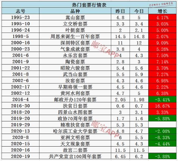 扶贫日套票今日行情为0.7元,昨日价格为0.6元,上涨16.67%。深圳特区套票今日行情为12元,昨日价格为11元,上涨9.09%。永乐宫套票今日行情为4.3元,昨日价格为4元,上涨7.5%。武当山套票今日行情为5.9元,昨日价格为5.5元,上涨7.27%。陶瓷套票今日行情为3元,昨日价格为2.8元,上涨7.14%。汝窑套票今日行情为4.6元,昨日价格为4.3元,上涨6.98%。黄河水利套票今日行情为5元,昨日价格为4.7元,上涨6.39%。亚洲文明套票今日行情为5.5元,昨日价格为6元,下跌8.33%。