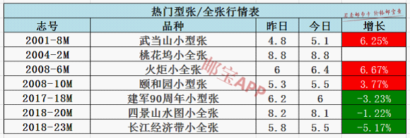 火炬小全张今日行情为6.4元,昨日价格为6元,上涨6.67%。武当山小型张今日行情为5.1元,昨日价格为4.8元,上涨6.25%。颐和园小型张今日行情为5.5元,昨日价格为5.3元,上涨3.77%。长江经济带小全张今日行情为5.5元,昨日价格为5.8元,下跌5.17%。