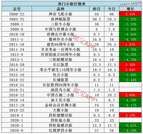 神舟飞船小版今日行情为60元,昨日价格为58元,上涨3.45%。世博会开幕小版今日行情为8元,昨日价格为8.7元,下跌8.05%。共青团成立90周年小版今日行情为9元,昨日价格为9.5元,下跌5.26%。儒林外史小版今日行情为16元,昨日价格为16.8 元,下跌4.76%。辛亥革命一百周年小版今日行情为10元,昨日价格为10.5元,下跌4.76%。三轮蛇赠送版今日行情为10元,昨日价格为10.5元,下跌4.76%。红楼梦四小版今日行情为20元,昨日价格为21元,下跌4.76%。