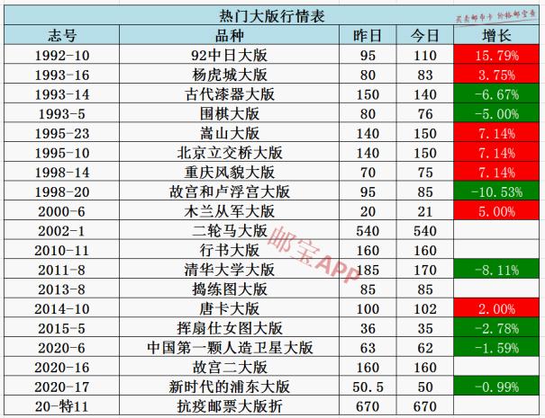 92中日大版今日行情为110元,昨日价格为95元,上涨15.79%。嵩山大版今日行情为150元,昨日价格为140元,上涨7.14%。北京立交桥大版今日行情为150元,昨日价格为140元,上涨7.14%。重庆风貌大版今日行情为75元,昨日价格为70元,上涨7.14%。木兰从军大版今日行情为21元,昨日价格为20元,上涨5%。故宫和卢浮宫大版今日行情为85元,昨日价格为95元,下跌10.53%。清华大学大版今日行情为170元,昨日价格为185元,下跌8.11%。古代漆器大版今日行情为140元,昨日价格为150元,下跌6.67%。