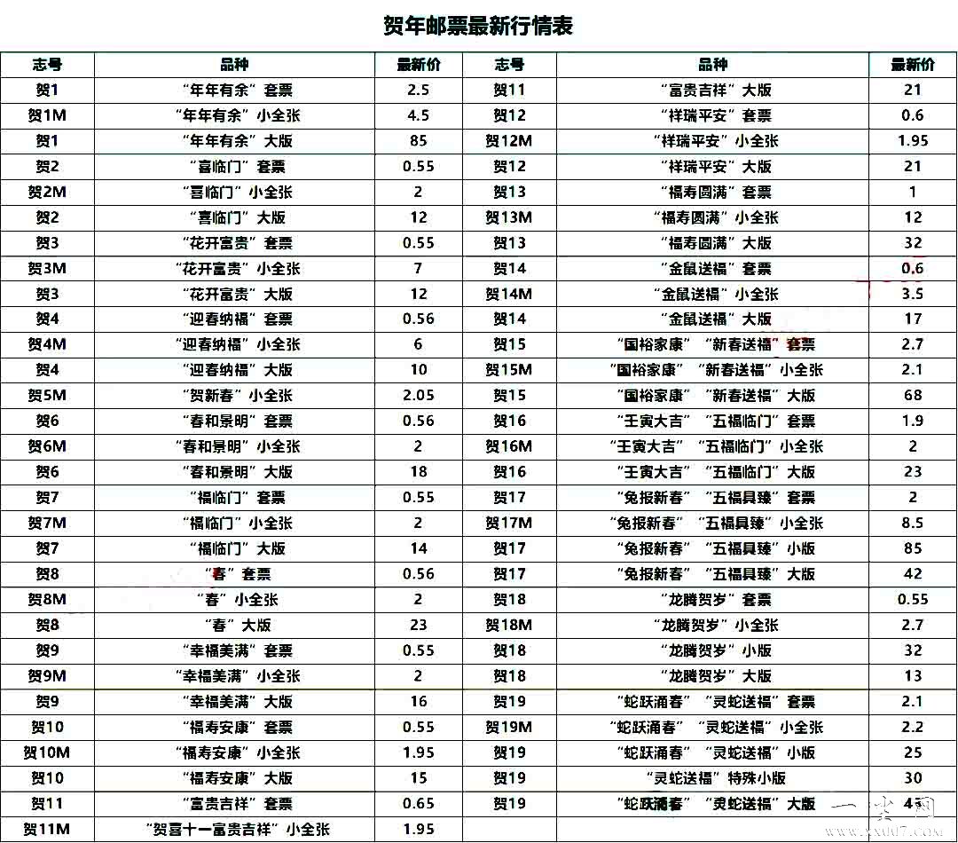 贺年邮票最新行情表