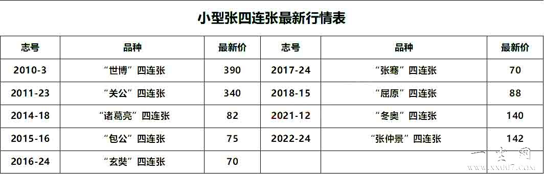 小型张四连张最新行情表