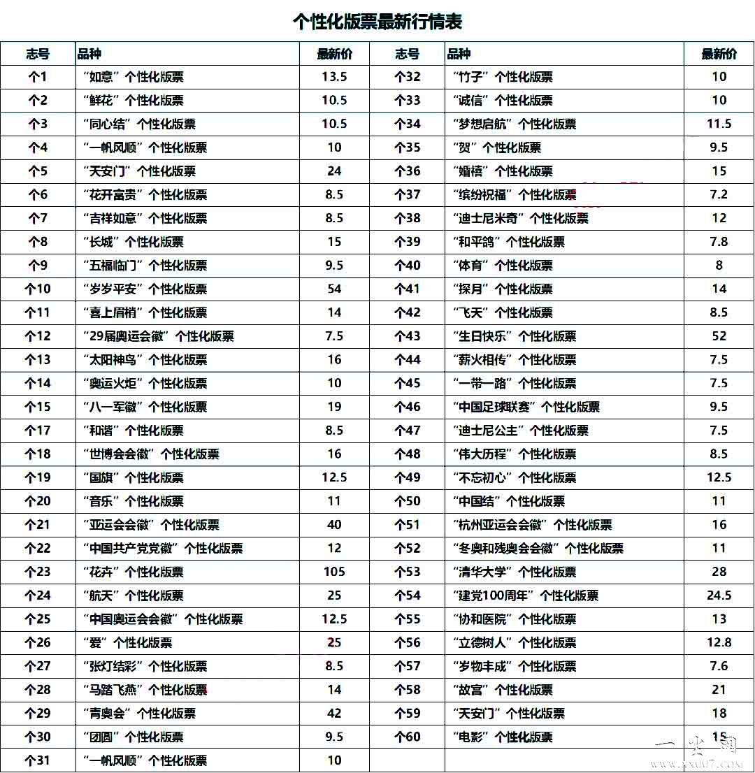 个性化邮票版票最新行情表