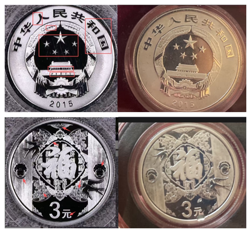 对比真假贺岁币图案不难发现,真品2015贺岁银币(左)具备以下特征:镜面底面+喷砂工艺处理,背景部分呈现高光镜面效果,图案文字则采用均匀细腻的喷砂,形成强烈对比;标准面额字体:“3元”字样使用专用防伪字体,笔画粗细一致,边缘锐利。而市面上出现的这枚仿品(右)在喷砂工艺上偷工减料,导致整体画面灰暗无层次,更有甚者直接用章类模具压制,缺乏纪念币独有的立体感。消费者一旦发现此类问题,务必要提高警觉。
