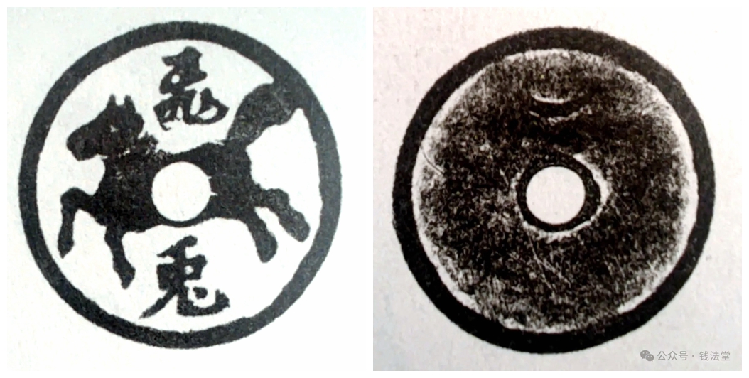 四是一面铸有骏马图案,并加马名,一面光背无文。如“飞兔”马图、 “赤兔”马图、“绝地”马图等。“飞兔”也称“ 飞菟 ”,骏马名,据说可以日行万里,驰若兔之飞,所以得名。赤兔原为吕布的骏马,后为关公坐骑。《三国志》记载:“布有良马,号曰赤兔。”《三国演义》第三回记载:“有良马一匹,日行千里,渡水登山,如履平地,名曰赤兔。”