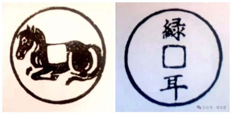 二是一面铸有骏马图案,一面铸以马名,多为历史上传说中的名马。如“白义”、“渠黄” “绿耳”、“赤骥”、“骅骝”、“骐骥”、“赤电”等。白义、渠黄、绿耳、骅骝、赤骥均位列周穆王的八骏之中。“绿耳”也叫“騄駬”,《幼学琼林》记载:“騄駬骅骝,良马之号。”骐骥泛指骏马、良马,《荀子·劝学篇》记载:“骐骥一跃,不能十步。”