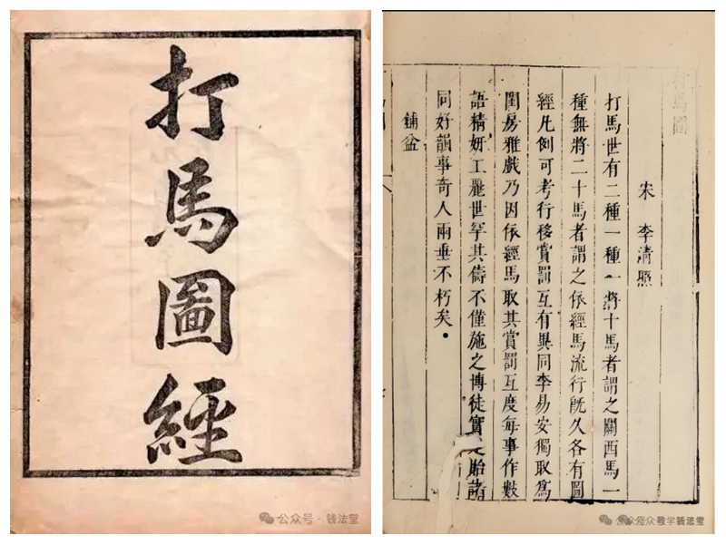 在《打马图经》<序>中,李清照对这一游戏有较为详细的描述,“打马世有二种:一种一将十马,谓之关西马;一种无将,二十四马,谓之依经马。流传既久,各有图经。”她经常和其夫赵明诚等文人玩耍,认为是“打马爰兴,樗蒱遂废,实小道之上流,乃深闺之雅戯”。