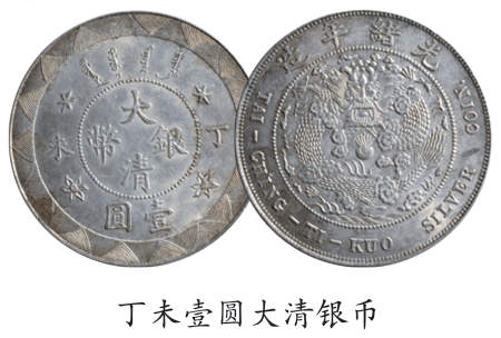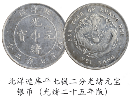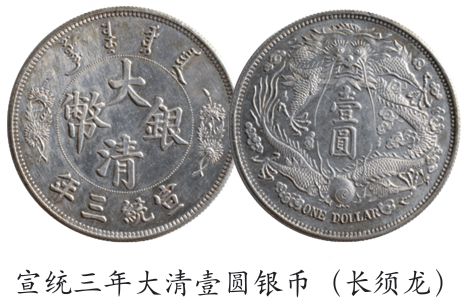 中国近代大规模正式机制银币的铸造始于广东。在两广总督张之洞主导下,光绪十五年(1889年),广东银元局铸造出名为“光绪元宝”的银币一套,面值有五种。这种银币因为背面铸有蟠龙图案,俗称“龙洋”。由于龙洋投入市场后很受百姓欢迎,清廷遂下令各省可设立钱局自行鼓铸本省银币。清末机制银币种类繁多,因铸造省份、年份、版别的不同而差异显著,但背面图案大多以蟠龙为主,主要表现手法是突出龙头的正面形象,龙身盘曲环绕,构成一个完整的环形图案,设计美观大方、威风凛凛。