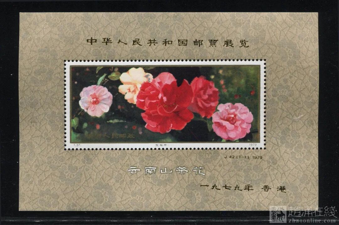 但他们没有从头设计新图案,而是用了一个非常巧妙的办法——把同年刚发行的T37《云南山茶花》小型张拿出来,在票面上加印了一行字:“中华人民共和国邮票展览 一九七九年 香港”,志号改为J42M。