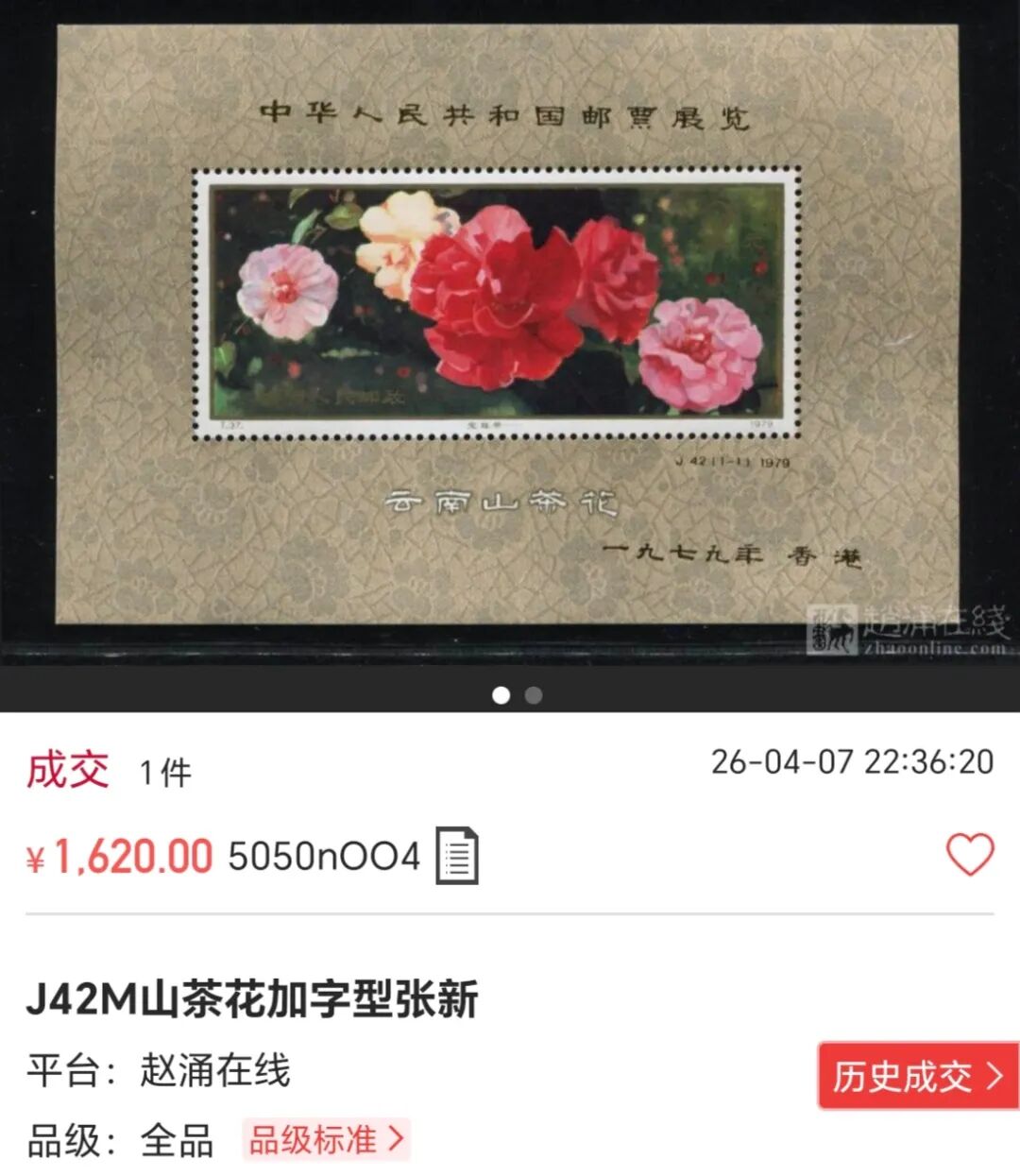 一枚J42M山茶花加字型张,全新全品,成交价1620元!