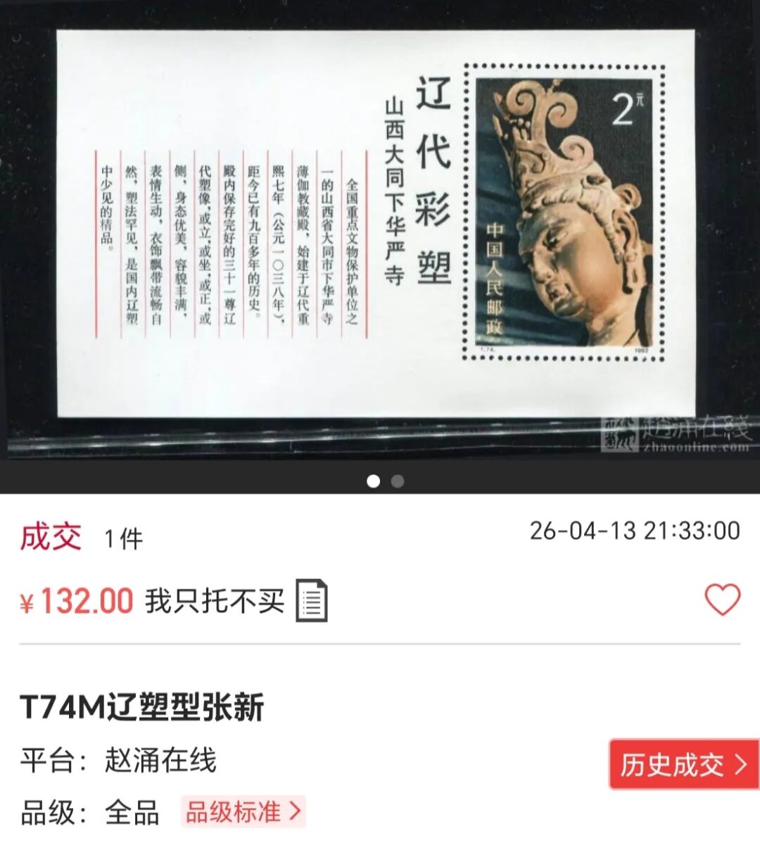 看看真实的市场价格。2025年7月16日,一枚T74M辽塑上品小型张在拍卖中以86.92元成交。到2026年4月13日,同品种的小型张已涨至132元。